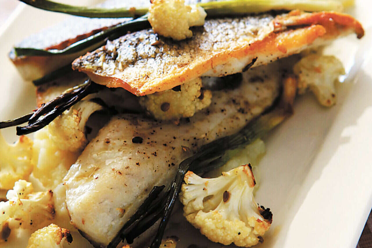 מסדרים על צלחות הגשה את המחית, מניחים עליה שני נתחי דג לכל מנה, מקשטים בכרובית צלויה ובבצל ירוק קצוץ ומגישים מייד.