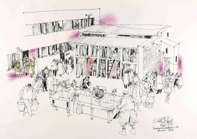 בין הניצולים הצייר שמוליק כץ ("דירה להשכיר"). בתמונה איור של זיכרונותיו מבית הזכוכית // איור: שמוליק כץ
