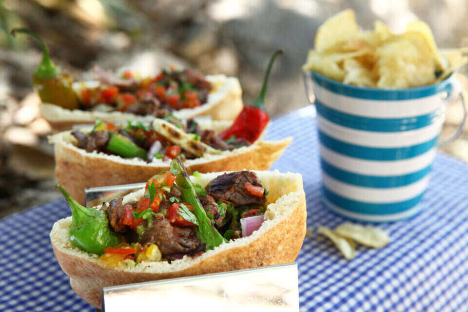ממלאים את הפיתות בנתחי הבקר, בטחינה ובסלט ומגישים.