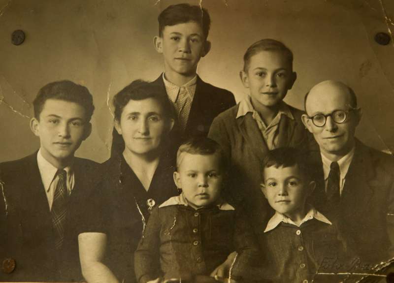 מוטל'ה (יושב בחיק אמו) עם משפחתו. "ביום ראשון הייתי הולך עם אבא לבית ספר, להצדיק את חילול השבת"