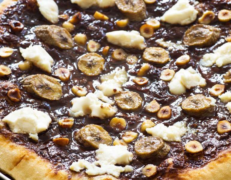 לאחר לילה מוציאים את הבצק מהמקרר ומרדדים לעיגול בקוטר 32 ס"מ. מורחים את השוקולד שבחרתם, מפזרים בננות, אגוזי לוז וריקוטה ואופים בתנור שחומם לחום הגבוה ביותר 10-12 דקות, עד שהפיצה שחומה בהיקפה.