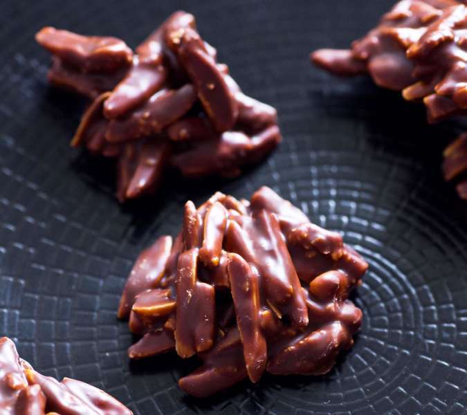 מכינים את הציפוי: מטמפררים את השוקולד המריר (ראו מתכון מנדיאנט), מוסיפים את שמן גרעיני הענבים ומכניסים פנימה את מקלות השקדים, מערבבים מעט עד שכל מקלות השקדים ייעטפו ובעזרת כפית מניחים בתוך מנג'טים בקוטר 4 ס"מ או בתבנית מרופדת בנייר אפייה (עיגולים באותו הקוטר). ממתינים כרבע שעה עד להתייצבות, מעבירים לכלי אטום ושומרים עד עשרה ימים מחוץ למקרר.