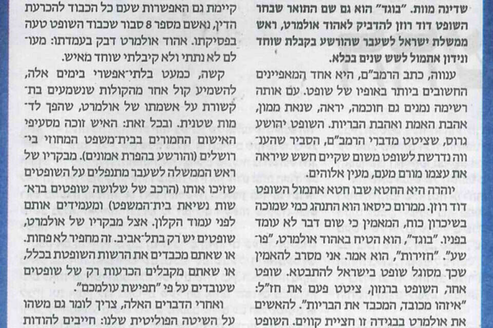 ואוטוסטרדת התמיכה נמשכת. "האם יוזכר שם כמי שנחשב על ידי לא מעט אנשים כאחד מראשי הממשלה הטובים שהיו כאן. האם יהיה מקום לציין את אומץ לבו במקרים שעליהם אנו לומדים ממקורות זרים, על המאמצים שלו להגיע להסכם שלום עם הפלשתינים או על כך שכהונתו היתה תור הזהב של מדינת ישראל ביחסיה עם העולם", מתרגשת סימה קדמון בעמוד 3. "לא צריך להיות פסיכולוג כדי להבין שרוזן לא אהב את אולמרט", היא מוסיפה ומנחמת: "זה לא סוף דבר. אולמרט יערער לבית המשפט העליון".
