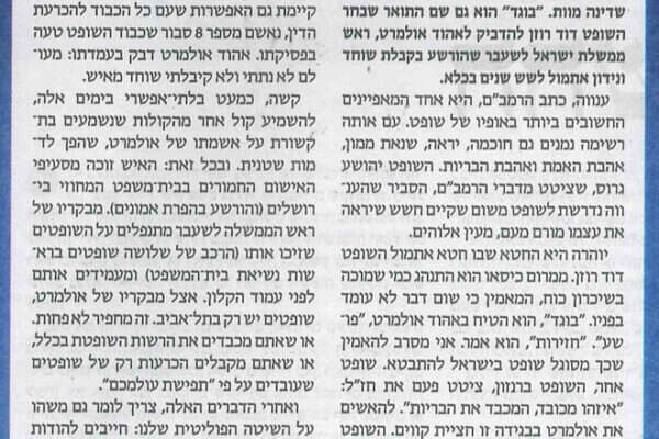 ממש מעל למאמר פורסמה תמונה מכמירת לב של אולמרט, שגודלה שווה לו. ובעמוד 4 ניצב "הוא זכאי" מבית "ידיעות" - במאמר דעה גדול הולם שמעון שיפר בכל מי שהעז (!) לכנות את אולמרט "בוגד". שיפר מאשים את השופט רוזן בחטא היוהרה: "ממרום כיסאו הוא התנהג כמי שמוכה בשיכרון כוח, המאמין כי שום דבר לא עומד בפניו. 'בוגד' הוא הטיח באהוד אולמרט, 'פושע'. 'חזירות', הוא אמר. קיימת גם האפשרות שעם כל הכבוד להכרעת הדין, נאשם מספר 8 סבור שכבוד השופט טעה בפסיקתו".