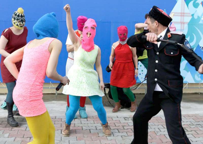 בנות להקת פוסי ריוט מולקות על ידי אנשי אבטחה בימי האולימפיאדה בסוצ'י. ניצלו את ההתקפה לשיר מחאה נוסף. צילום: אי. פי