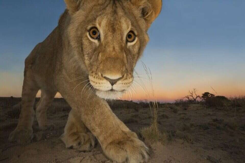 כמעט חמש שנים עבד הנס לוכנר על שכלול הטכנולוגיה האלחוטית שבנה כדי לצלם חיות בר באפריקה. בתמונה הזאת הוא הצליח לפתות את גור האריות הסקרן להתקרב למצלמה על ידי סגירה חוזרת ונשנית של תריס המצלמה. "כל ההגדרות היו על מצב ידני, כך שיכולתי רק לקוות שהערכתי נכון את התאורה ואת הזווית", הוא אומר.