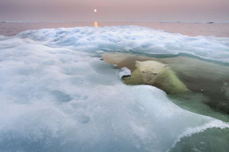 "שינוי האקלים מציב סכנות ייחודיות לאוכלוסיית דובי הקוטב של מערב מפרץ הדסון בקנדה", מסביר פול סאודרס. התמונה, שבה נראה דוב קוטב מתחת לקרח מפשיר, צולמה בחודש יולי, במהלך גל חום שבו הגיעו הטמפרטורות ל־30 מעלות וגרמו לדליקות יער בלב היבשה.