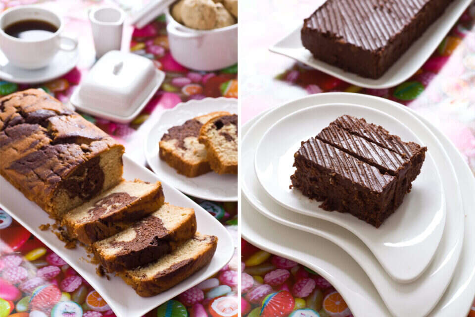 יוצקים שני שלישים מהתערובת לתבנית משומנת ומעל יוצקים את השוקולד המומס. מכסים ביתרת התערובת ומערבבים מעט באמצעות סכין ליצירת מראה שיש. אופים כ־50 דקות בתבנית העגולה או 45-50 דקות בתבניות המוארכות, עד שנועצים קיסם והוא יוצא יבש עם פירורים לחים. שומרים מחוץ למקרר עד חמישה ימים.