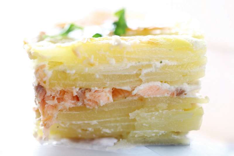 4. בתבניות אפייה אישיות המתאימות להגשה מסדרים שכבה צפופה של תפוחי אדמה עד כמעט מחצית מהגובה. מניחים מעל שכבה של סלמון ומכסים בפרוסות תפוחי אדמה.