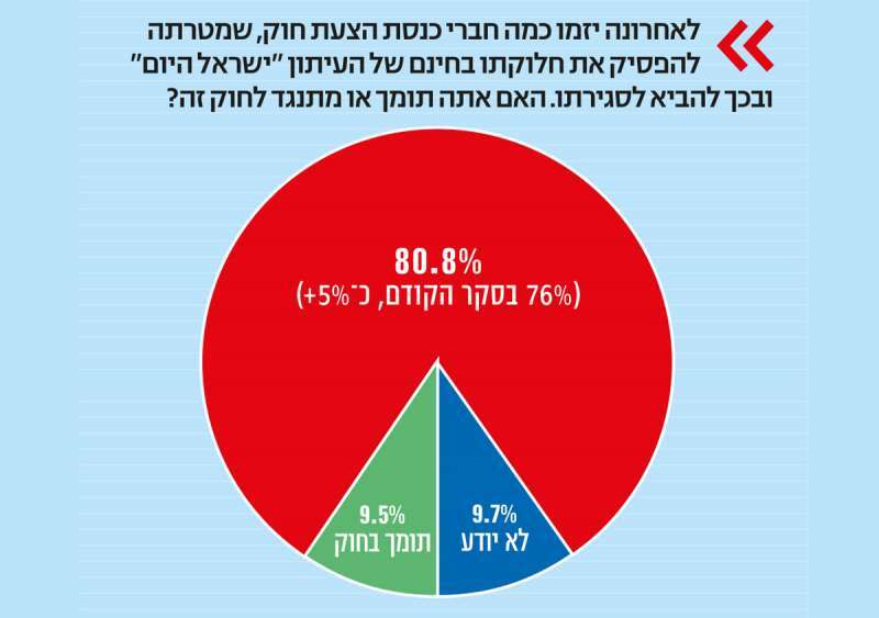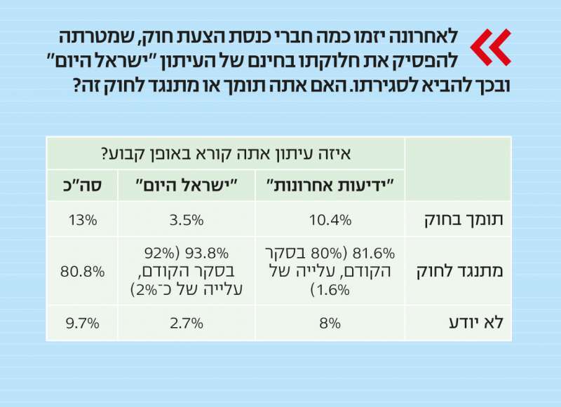 גוברת התנגדות הציבור להצעת החוק שנועדה לפגוע ב"ישראל היום", בדרך של איסור הפצת עיתון יומי חינם. כך עולה בבירור מתוצאות סקר שערך השבוע "ישראל היום" באמצעות מכון המחקר הגל החדש.