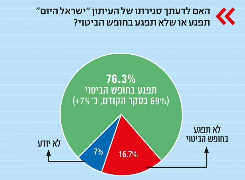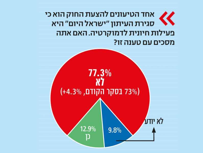 המחקר החדש מחזק את התובנה כי הציבור אינו קונה את הניסיונות הפתטיים של יוזמי החוק להציגו כאילו הוא תורם לחיזוק הדמוקרטיה בישראל. מספר השוללים את הטענה שסגירת העיתון היא פעילות חיונית לדמוקרטיה עלה חדות ל־77.3% (לעומת 73% בסקר הקודם). עלייה דומה נרשמה גם בקרב אלה החושבים שהצעת החוק פוגעת בחופש הביטוי, במקום לחזק אותו כטענת מציעי החוק; 76.3% חושבים שההצעה אכן פוגעת בחופש הביטוי (לעומת 69% בסקר הקודם).