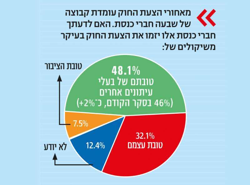 הציבור גם אינו מהסס לקרוע את המסווה מעל פרצופם של מציעי החוק: 70.5% מבינים שמאחורי החוק עומדים אינטרסים של בעלי עיתונים אחרים. ומדוע הסכימו הח"כים החתומים על ההצעה להציע אותה? רק 7.5% מכלל המשתתפים מאמינים כי טובת הציבור עומדת לנגד עיניהם. 48.1% מזהים את טובתם של בעלי עיתונים אחרים (לעומת 46%), ו־32.1% חושבים שהח"כים מציעים את החוק ממניעים אנוכיים - טובת עצמם מניעה אותם. כלומר, רוב מכריע של יותר מ־80% מאזרחי המדינה מבין היטב כי החוק מוצע לא ממניעים טהורים של שמירת ערכי הדמוקרטיה וחופש הביטוי, כמו שמנסים להציגו מציעיו, אלא ממניעים זרים - בין שמדובר במניעיהם האישיים של המציעים ובין שבמניעיהם של בעלי עיתונים אחרים.