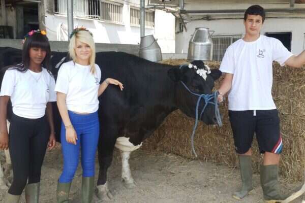צילום: תקשורות יעל שביט // תלמידי בית הספר החקלאי שפיה עם הפרה המנצחת "נובלה"