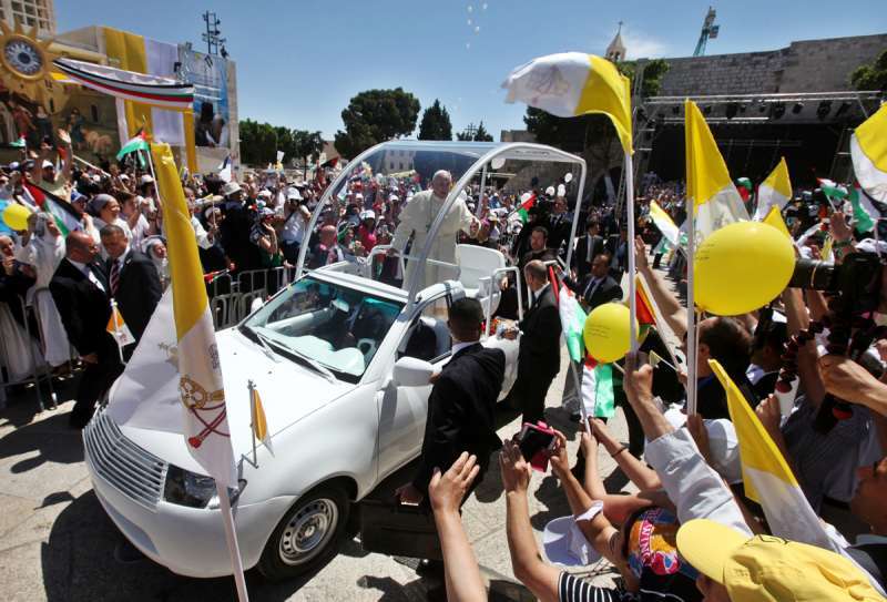 פופ סטאר. פרנסיסקוס מנופף לקהל המאמינים בבית לחם