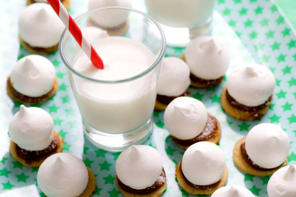 חוצים את הבצק לשני חלקים ומרדדים כל חלק לעלה בעובי כ־1/2 ס"מ בעזרת מערוך מקומח. קורצים עיגולים בקוטר 3 ס"מ ומסדרים בתבניות מרופדות בנייר אפייה במרווחים של 2 ס"מ זה מזה. אופים 12-15 דקות עד להזהבה. מצננים את העוגיות והנשיקות היטב, ולאחר מכן מרכיבים: מעבירים את ריבת החלב לשקית זילוף ומזלפים על העוגיות ריבת חלב ומעליה מניחים מרנג.