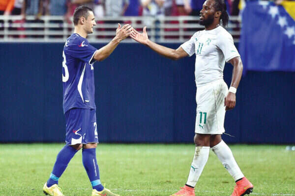 הכדורגל עושה למען המדינה // צילום: USA Today Sports // הכדורגל עושה למען המדינה. דרוגבה מחוף השנהב (מימין) וסליהוביץ' מבוסניה־הרצגובינה