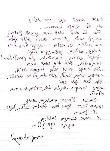 אנחנו מחבקים אתכם ואת ההורים והאחים שלכם. סומכים עליכם במאתיים אחוז, ומודים לכם מעבר למה שמילים יכולות לתאר. ה' עמכם, ה' ישמור צאתכם ובואכם מעתה ועד עולם", לשון המכתב.