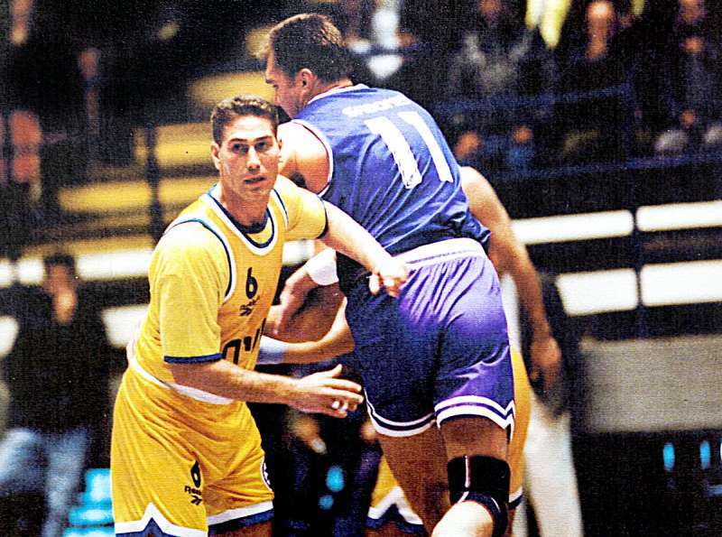 במדי מכבי ת"א ב־1994, מול סאבוניס וריאל מדריד. הצילום תלוי עד היום על הקיר בהיכל // רפרודוקציה: קובי קלמנוביץ'