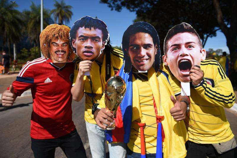 אוהדי קולומביה עם תמונות של רודריגס, פלקאו, קווארדדו וולדראמה. חולמים על חצי הגמר // צילום: אי.אף.פי