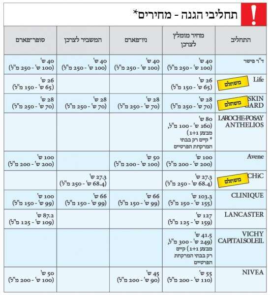 המחיר בטבלה הוא המחיר המחושב ל־100 מ"ל. מחיר המוצר כפי שמופיע ברשתות מופיע בסוגריים. המחירים נבדקו בתאריך 15.06.14