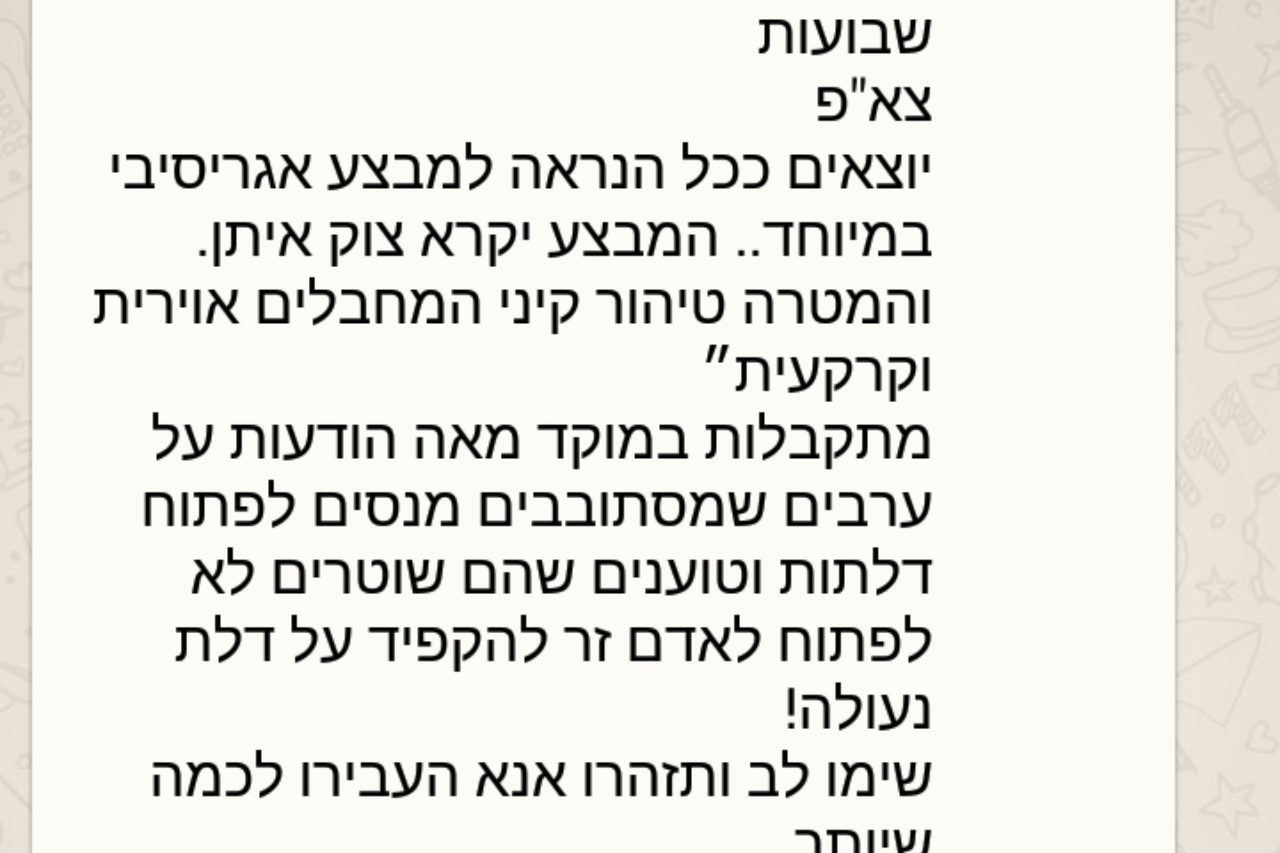 תחת הכותרת המאיימת והרשמית לכאורה - "הנחיות משטרתיות וצבאיות" - הופצו אתמול הודעות הקשורות למצב הביטחוני באפליקציית ווטסאפ.
