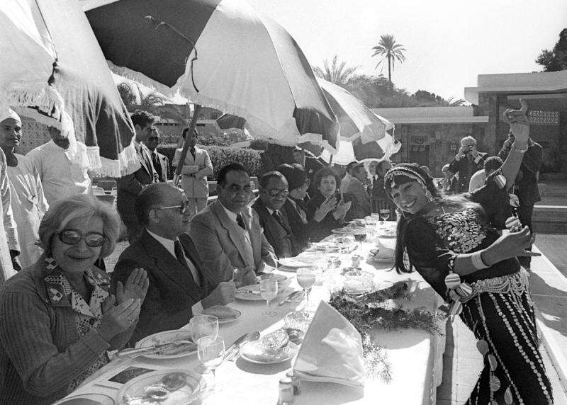 רקדנית בטן מופיעה מול בגין ורעייתו עליזה, במהלך ביקור רשמי במצרים, 1980. "הרגישו נינוחים לידי"