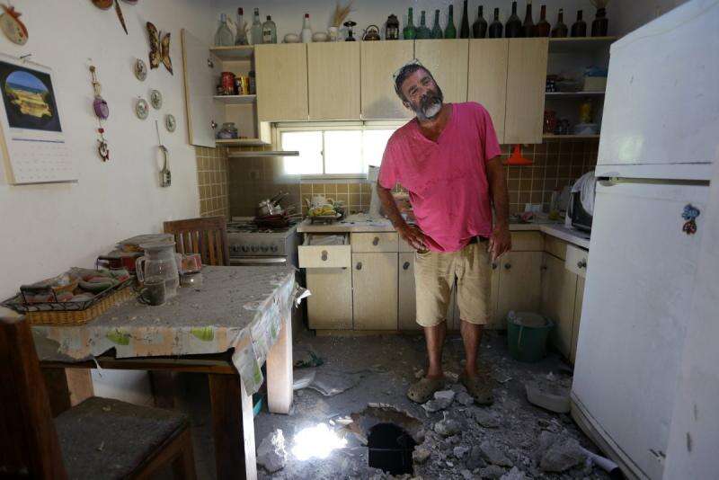ניצל בנס. תושב קיבוץ עין השלושה עומד במטבח ביתו, שספג פגיעה ישירה של פצמ"ר ביום שישי שעבר