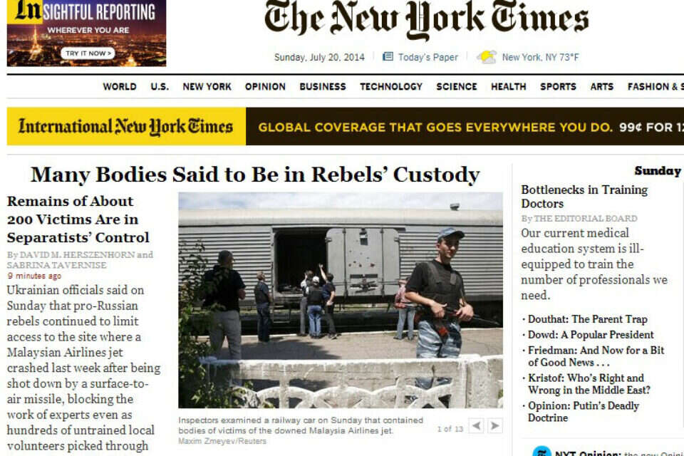 גם האתרים של CNN והעיתון "ניו יורק טיימס" התייחסו בהבלטה ל"הרג בעזה", אבל בדיוק כמו הבריטים גם הם בחרו שלא להפיל את המטוס המלזי מהראשיות. ה"ניו יורק טיימס" דיבר בראשית על גופות, אבל לא מעזה כי אם אלה של הנוסעים.