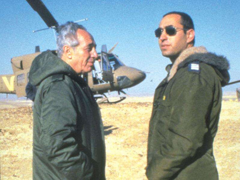 1985: שמעון פרס מבקר את בנו הטייס חמי, אי שם בדרום // צילום:הרמן חנניה/לע"מ