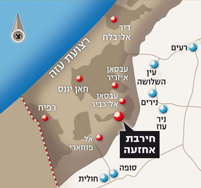 את מפקד חטיבת גבעתי, אל"מ עופר וינטר, אנו פוגשים על גג אחד הבתים ההרוסים. "אין פה בית שאין בו רוע", הוא מסביר לנו, תוך כדי שהוא מצביע על הבתים שסביבנו, "האוכלוסייה פה קיללה את חמאס, למרות שאין פה משפחה שאין בה מישהו בחמאס או בג'יהאד האיסלאמי. זה רוע טבוע. כל בית הוא בית של פעיל. פגענו פה בעשרות מחבלים, מצאנו הרבה מאוד אמצעי לחימה, נגענו בכמה תשתיות של מינהור. המנהרות מכאן מגיעות עד לניר עוז. חירבת אחזעה היא אחד המעוזים שעשו ליישובים פה חיים קשים. מצאנו פה מתחמי שיגור והרבה אמצעי לחימה".