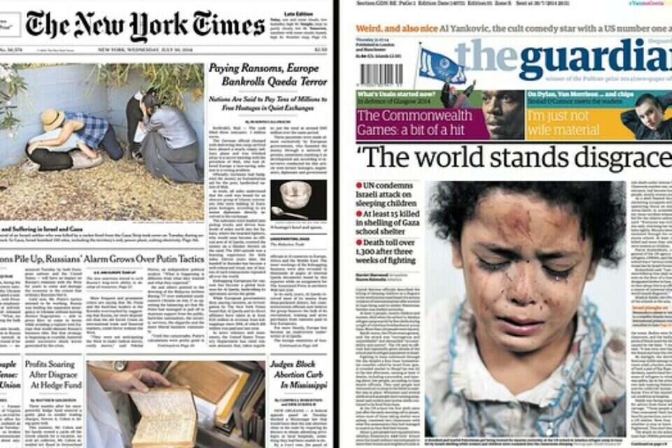 שאר הדיווחים היו שונים מאוד מהדיווח של ה"ניו יורק טיימס". העיתון הבריטי ה"גרדיאן" ביקורתי מאוד כלפי ישראל, בדומה לשאר העיתונים הבריטיים. אתמול הוא פירסם צילום גדול של ילדה פלשתינית פצועה בוכייה תחת הכותרת "העולם עומד נכלם". כל מי שנתקל בעמוד השער הזה אתמול למד שלושה דברים: