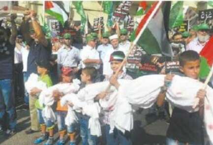 As the fighting in Gaza continued over the weekend, the northern branch of the Islamic Movement held a series of demonstrations against the government and the Israel Defense Force's operation in the Gaza Strip. The main demonstration was held on Saturday in the western Galilee Arab city of Tamra. More than 10,000 demonstrators took part. Protesters waved Palestinian, Hamas and Islamic Movement flags and banners and called out slogans against the Israeli government and the IDF, claiming that "genocide is being committed in Gaza." At the head of the protest marched the northern branch of the Islamic Movement's firebrand leader, Sheikh Raed Saleh. Marching alongside Saleh were several children holding baby dolls draped in shrouds stained with blood-red paint, symbolizing attacks against children in Gaza. The demonstration began without any serious disruptions save a few attempts by activists to disrupt the order and confront police officers. Among the demonstrators were Arab Knesset members and public officials, including MK Hanin Zoabi, as well as several left-wing activists. Meanwhile in Judea and Samaria, several more demonstrations were held, but those spiraled into violence as protesters clashed with IDF forces. Palestinians reported that two people were killed in the ensuing confrontations. In Ramallah on Friday, a Palestinian in his 20s was shot to death during a demonstrations as protesters clashed with the IDF. At a separate protest in Tulkarem, some 2,000 demonstrators gathered. Many threw stones, metal pipes and firebombs at IDF forces. A 24-year-old Palestinian was killed.