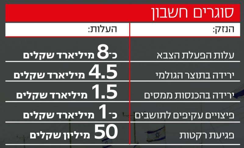 עם סיום מבצע צוק איתן, אפשר לפתוח את ספרי החשבונות ולסכם את הנזק הכלכלי. מנהל רשות המסים, משה אשר, אמר אתמול כי המבצע עלה עד כה למשק כ־4.5 מיליארד שקלים - זאת עקב אובדן צמיחה של כ־0.5% תוצר. אשר מסר כי מדובר באומדן ראשוני שערך הכלכלן הראשי של משרד האוצר, יואל נווה.