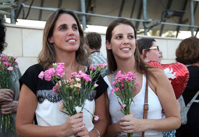 "לא ניתן לגזענות לנצח". צעירות שהגיעו להביע תמיכה בזוג // צילום: גדעון מרקוביץ'