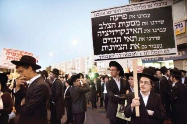 Seventeen ultra-Orthodox men were arrested Sunday in violent protests against the arrest of a yeshiva student who failed to show up at an army recruitment center on his draft date. Thousands of haredi followers of Rabbi Shmuel Auerbach took to the streets in Jerusalem, Bnei Brak and Beit Shemesh, among other cities, to demonstrate against the arrest. The protests also brought to the surface the tensions in the Lithuanian haredi community between the followers of Rabbi Aharon Yehuda Leib Shteinman and Auerbach's smaller group of followers, who urge for a more extremist stance on all issues related to the State of Israel. "In the Jewish state, they put a yeshiva student in jail because he wants to continue learning Torah," said Yosef Ehrenthal, a protestor at the demonstration in Bnei Brak. "What a terrible thing. They are truly causing a civil war, sending policemen on horses against us, just to hurt us. We will not give up, we will continue to fight and protest against the army and the state, even if we have to pay with our lives." Protesters in Bnei Brak tried to block Geha Interchange, a major roadway, but were stopped by police. They carried signs with slogans including "No compromises, no concessions" and "Death is better than sin." Several protesters made derogatory statements against the police, and one was arrested. In Jerusalem, eight protesters were arrested. Several protesters lit a garbage can on fire and tried to use it to block a major street, while others threw stones at police. One police officer was injured in the arm. Three protesters were arrested in Beit Shemesh, two for trying to block streets and one for attacking a police officer. In Ashdod, about 100 yeshiva students attempted to block a major street. After ignoring repeated warnings, five were arrested for disturbing the peace and fighting with police officers.
