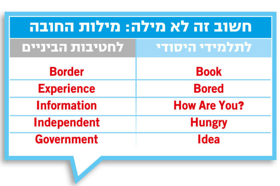 lnformation הוא כוח, אין חכם כבעל Experience, ואם כל זה גורם לכם לחוש Bored אתם מוזמנים לדפדף לעמוד הבא. מעתה והלאה, את המילים באנגלית במשפט הזה יוכל להבין כל תלמיד בבית הספר היסודי או בחטיבת הביניים, בעקבות שינוי שמבצע משרד החינוך בימים אלה בתוכנית הלימודים של השפה.