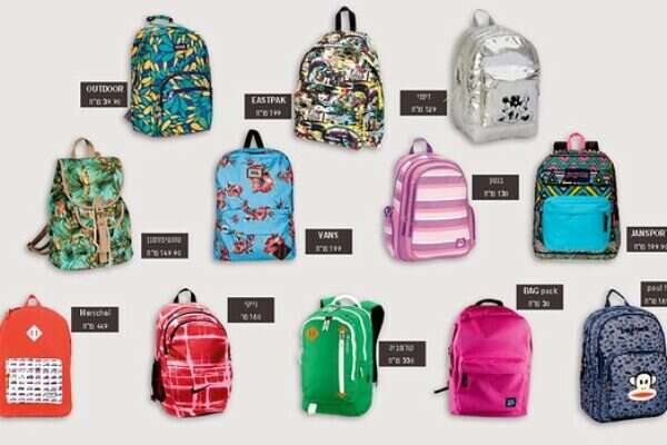 שורה עליונה מימין לשמאל: דיסני מחיר: 129 ש', EASTPAK מחיר: 199 ש', OUTDOOR (אופיס דיפו) מחיר: 39.90 ש'