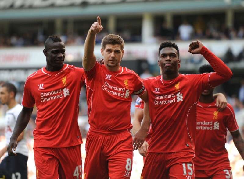 ג'רארד (באמצע) חוגג את השני עם סטארידג' (מימין) ובאלוטלי // צילום:אי.אף.פי