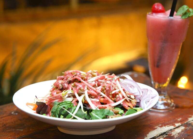 אני בוחרת לסעוד צהריים־ערב בקפה־מסעדה כיופים הסמוכה לצומת ירקון. כאן בחצר אני מסיימת את היום הנפלא במשקה סורבה קפוא עם תות ואוכמניות שחורות - מרענן וטעים מאוד, עם סלט בריאות עשיר שרוטב ויניגרט רימונים ורדרד מעטר את הנבטים הפזורים עליו ופוקצ'ת גחלים נפלאה, חמה וטרייה מעוטרת ברוזמרין. אנו נהנים גם מניוקי צבעוני בארבעה טעמים: תרד, תפוחי אדמה, בטטה וסלק, המוגש ברוטב שמנת ותרד, ומסטייק פרגית ברוטב צ'ילי, טריאקי, סויה וברביקיו - מנה מעט פיקנטית אך נפלאה.