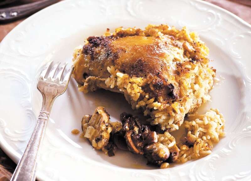 מחממים תנור ל־165 מעלות. מנגבים במגבות נייר את שאריות השמן וקמח המצה מהקדירה ומסדרים בה את נתחי העוף. מוסיפים את האורז ואת תערובת הבצל־שום־פטריות. מוסיפים כפית מלח גס וכפית פלפל טחון טרי ואת המים ומביאים לרתיחה. מכסים, מנמיכים חום ומבשלים 15-20 דקות. מסירים המכסה ומכניסים לתנור המחומם ל־30 דקות או עד שהאורז העליון זהוב־שחום.