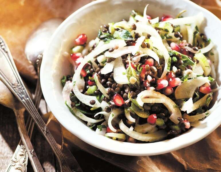 בזמן שהעדשים מתבשלות מכינים את השומר: שוטפים היטב, חותכים את התחתית, חוצים ומוציאים בעזרת סכין קטנה את המרכז הקשה. בסכין חדה וגדולה פורסים פרוסות דקות מאוד, מהתחתית לכיוון הגבעול. מפרקים את הפרוסות לקערה גדולה ומוסיפים את כל שאר המרכיבים מלבד העדשים וגרגרי הרימון. מניחים כשעה, שייספגו כל הטעמים. לפני הוספת העדשים טועמים ומעדכנים את התיבול (אם צריך). מוסיפים את העדשים וגרגרי הרימון, מערבבים ומגישים.