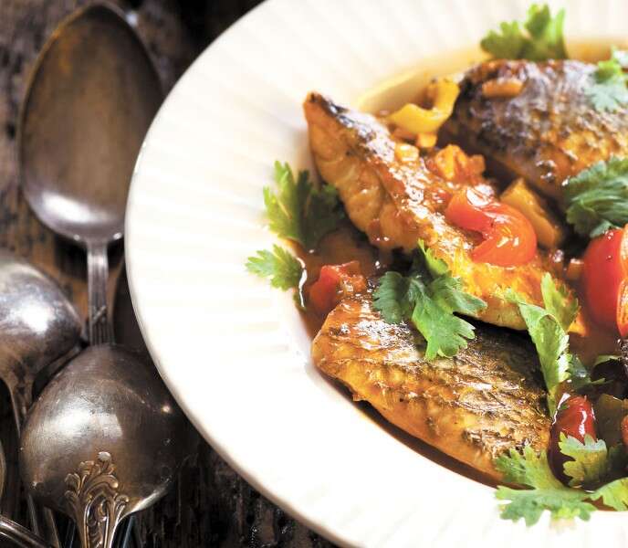 מערבבים את חומרי המשרה ומשרים את הדג במקרר למשך כחצי שעה. במחבת גדולה מחממים את שמן הזית. מטגנים את הבצל עד שיהפוך לשקוף, מוסיפים את שיני השום ומוסיפים לטגן עד שיפיצו ריח. מוסיפים את הפלפלים וממשיכים לטגן על אש קטנה עד שיזהיבו. מוסיפים את העגבניות והרסק ומוסיפים לבשל על אש בינונית כעשר דקות. מוסיפים את חלב הקוקוס, עשבי התבלין ואת המלח והפלפל. מוסיפים לבשל משך כחמש דקות, טועמים ומתקנים תיבול. מוסיפים פנימה את נתחי הדג ומוסיפים לבשל על אש בינונית כעשר דקות. מפזרים כוסברה בנדיבות ומגישים מעל אורז לבן.