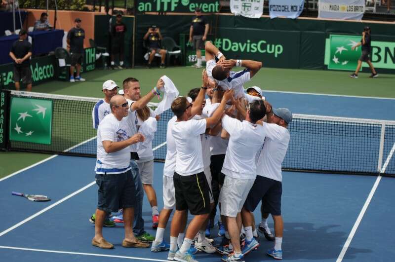 חברי המשלחת מניפים את אנדי רם אל על. מה שמגיע, מגיע // צילום: איגוד הטניס
