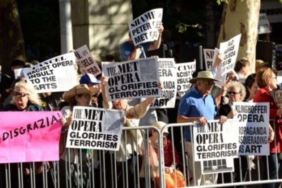 Demonstrators in New York have marked the start of the Metropolitan Opera's season by protesting the planned production of "The Death of Klinghoffer." They gathered outside Lincoln Center Monday carrying signs saying "The Met Opera glorifies terrorism." The protesters say the opera is anti-Semitic. The Met is scheduled to perform the opera between Oct. 20 and Nov. 15. The opera deals with the death of Leon Klinghoffer, a Jewish passenger on the cruise ship Achille Lauro in 1985. The ship was hijacked by Palestinian terrorists, who shot the wheelchair-bound Klinghoffer and threw him over board. The opera's critics say it justifies the killers' actions and is prejudiced against Jews. Supporters defend it on grounds of artistic freedom and claim it presents a thoughtful take on all sides.