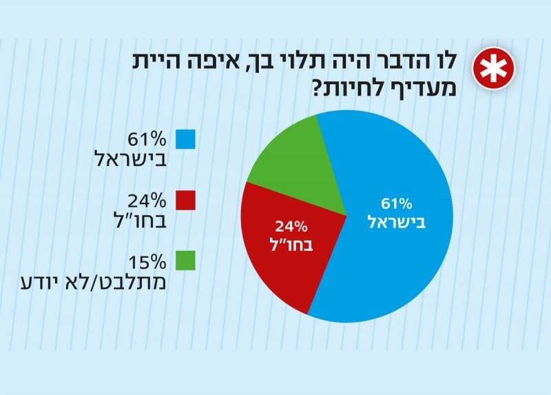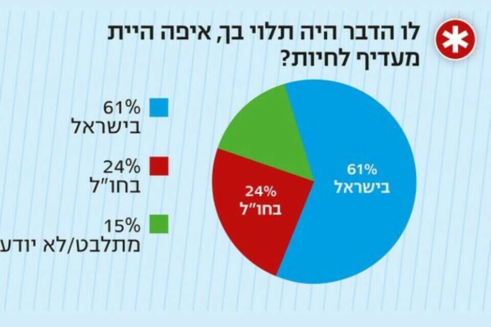 רק 24% היו מעדיפים לחיות בחו"ל ו־15% מתלבטים או לא קבעו עמדה. כך מעלה סקר "ישראל היום" לקראת השנה החדשה, שנערך באמצעות "הגל החדש".