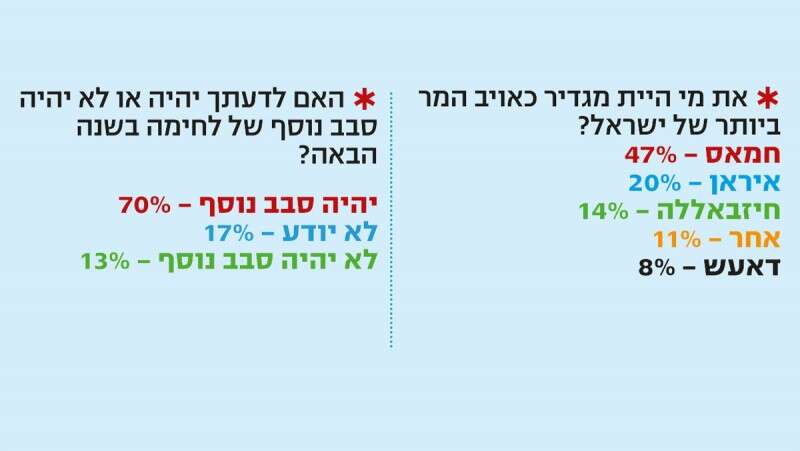 בהכללה, קשה לומר שמצב הרוח של הציבור מרומם במיוחד לקראת השנה החדשה; מדויק יותר להגדיר אותו כ"ככה וככה". בנושאים מסוימים הוא לא משהו; באחרים, כאמור, המצב מעודד יותר. אחת הדאגות הבולטות של הציבור, כפי שהיא משתקפת בתוצאות הסקר, היא החשש מפני חידוש האש בדרום: רוב מכריע של הנשאלים - 70%, סבור שכבר בשנה הבאה יתחולל סבב נוסף של לחימה עם הפלשתינים. רק 13% חושבים שלא יהיה עימות נוסף בשנה הבאה.