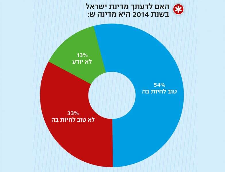 הנה החדשות הטובות: רוב מוצק של הציבור בישראל - 54%, אומרים שישראל היא מקום שטוב לחיות בו (לעומת 33% שלא חושבים כך). וכאשר מחדדים את השאלה הזו, בהינתן ברירה בידי הנשאל היכן היה מעדיף לחיות: בישראל או בחו"ל, רוב משמעותי של 61% מצהיר שהוא חי בארץ מבחירה, ושהוא מעדיף לחיות כאן, בארץ, על פני מגורים בחו"ל.