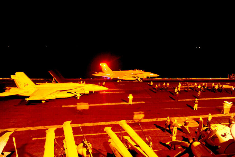 צילום: אי.אף.פי // מטוסי קרב אמריקניים מתכוננים להמריא לתקיפה מנושאת מטוסים
