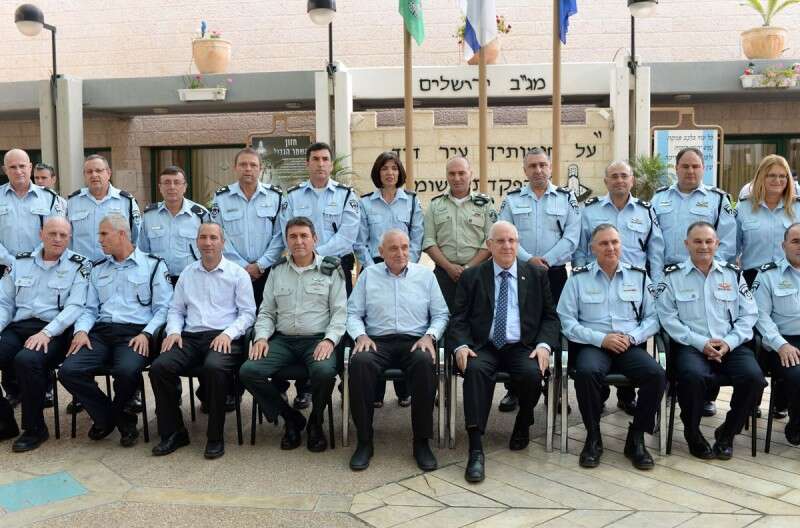הנשיא, השר והמפכ"ל עם סגל הפיקוד של משטרת ישראל, אתמול // צילום: קובי גדעון - לע"מ