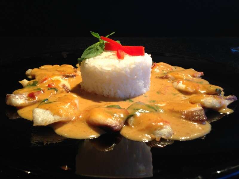 דג מבושל בחלב קוקוס, בזיליקום וצ’ילי חריף.